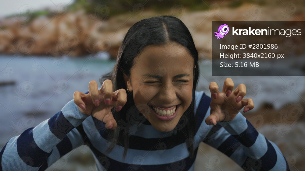 Hispanic woman in striped shirt at beach making claw gesture while smiling outdoors with seaside backdrop in a playful and joyful manner.