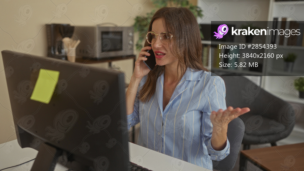 Hispanic woman in striped shirt holds smartphone to ear and gestures with hand while seated at desk in office; stress anxiety tension burnout.