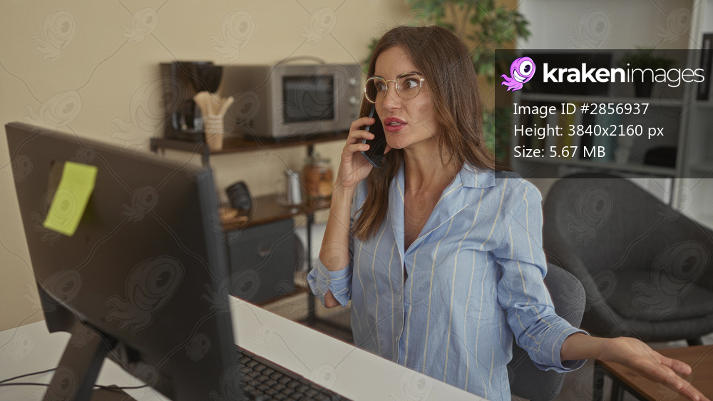 Hispanic woman in striped shirt holds smartphone to ear and gestures with hand while seated at desk in office; stress anxiety tension burnout.