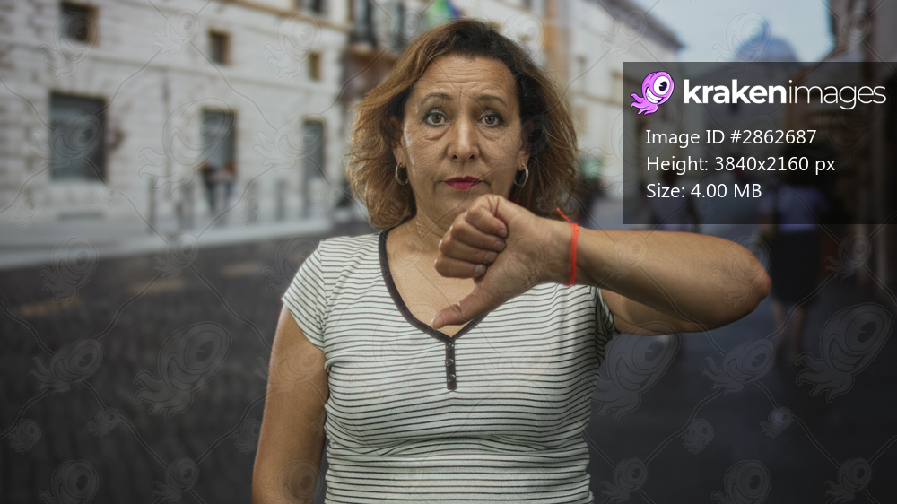 Hispanic woman in striped shirt shows thumbs down gesture on cobblestone street outside stone building; disapproval.
