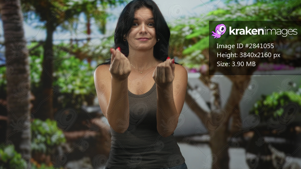 Hispanic woman in tank top beckons cash with slender fingers on sunny street; financial desperation.
