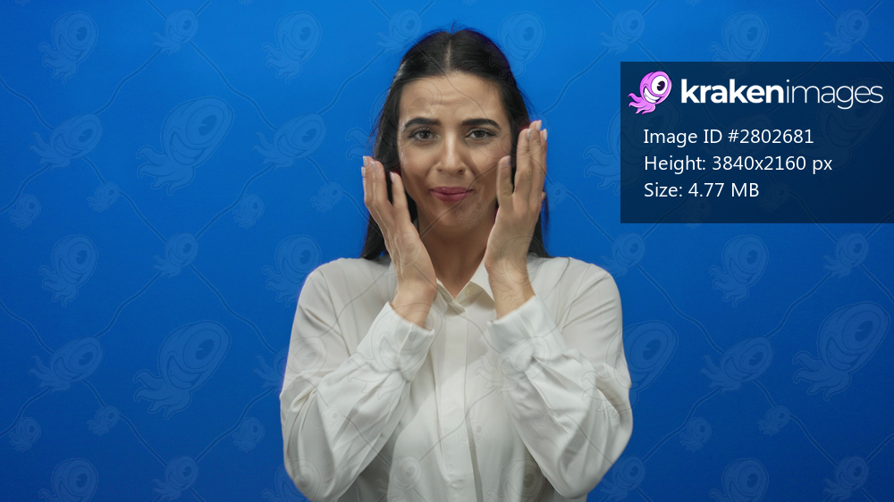 Hispanic woman in white shirt expresses surprise against a vibrant blue wall, showcasing varied emotional reactions through her facial expressions and hand gestures. - Kraken Images