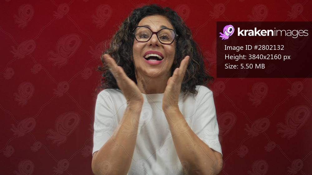 Hispanic woman in white shirt, showing surprise and joy on isolated red background.