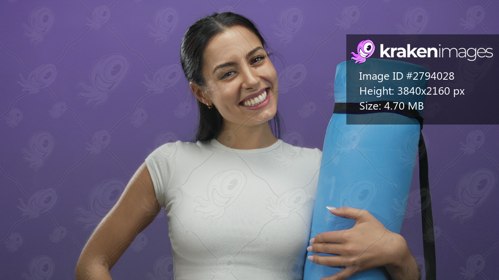 Hispanic woman in white shirt smiling while holding blue yoga mat against isolated purple wall background.