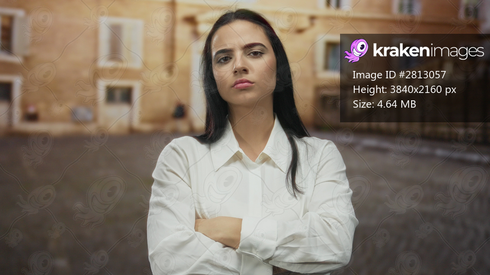 Hispanic woman in white shirt stands confidently with arms crossed in front of an old university building outdoors, exuding determination and focus in a historical campus setting. - Kraken Images