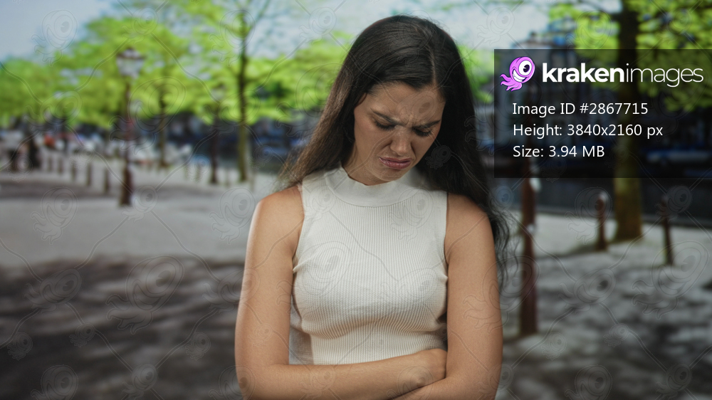 Hispanic woman in white sleeveless top shielding arm over eyes under bright sunlight on street; frustration.