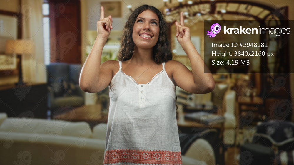 Hispanic woman in white sundress pointing both index fingers upward inside a building living room, smiling toward ceiling; joy celebration.