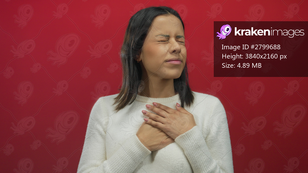 Hispanic woman in white sweater clutching heart in pain against isolated red background wall, expressing discomfort and emotion.
