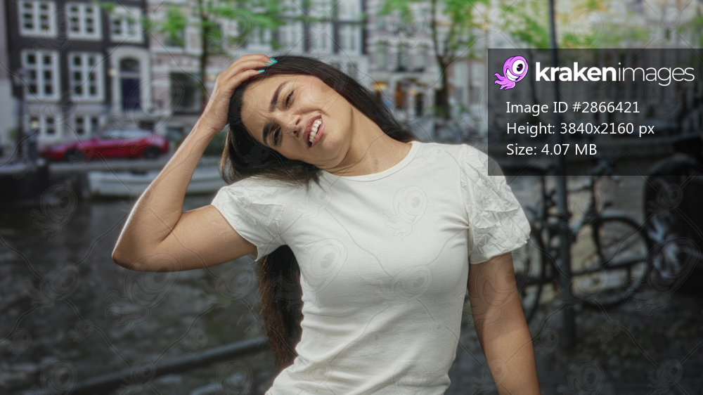 Hispanic woman in white t shirt holds hand to head by canal in amsterdam with bicycle rack nearby; discomfort.