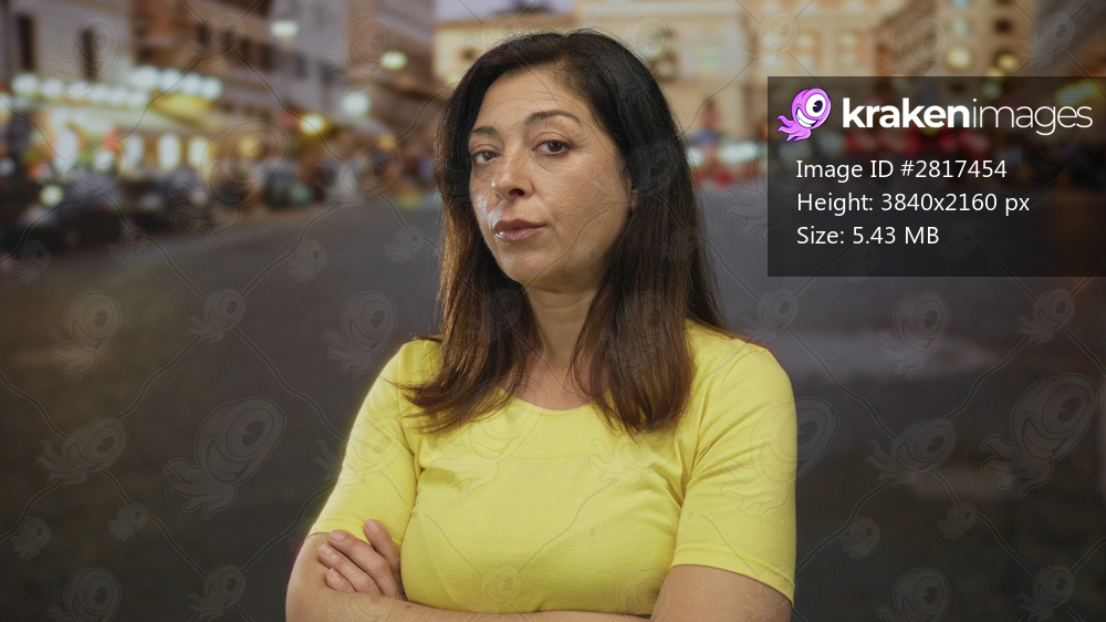 Hispanic woman in yellow shirt with arms crossed and stern expression on a bustling urban street at dusk; defiance.