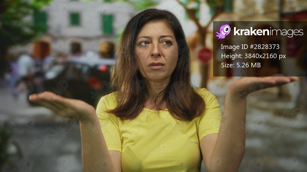 Hispanic woman in yellow shirt holds palms up on a city street amid a large blurred crowd; uncertainty.