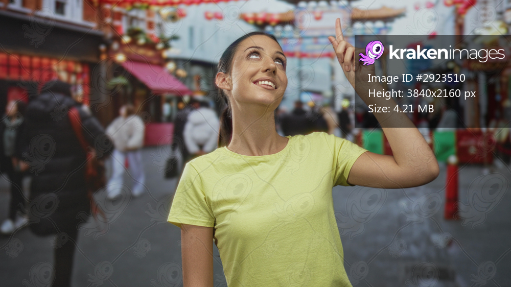 Hispanic woman in yellow t shirt points finger up on a crowded street market with blurred pedestrians and lantern decorations; playful confidence.