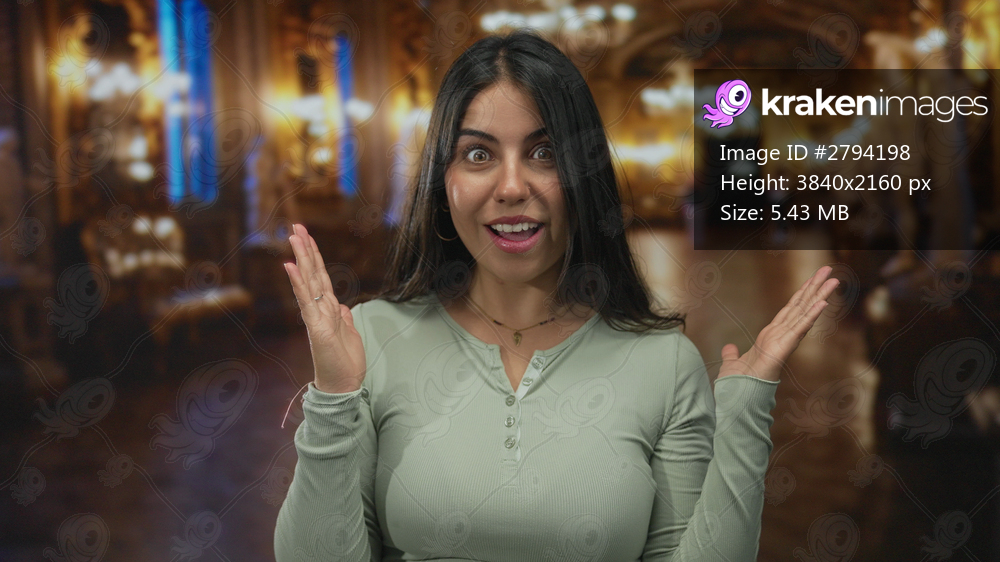 Hispanic woman indoors at museum, expressing surprise with hands raised, surrounded by ornate decor and soft lighting, capturing an indoor cultural experience. - Kraken Images