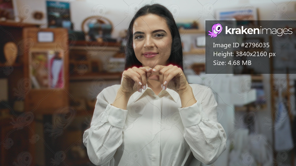 Hispanic woman indoors making heart gesture with fingers, showcasing emotion and connection in a cozy living room setting filled with warmth and friendliness. - Kraken Images