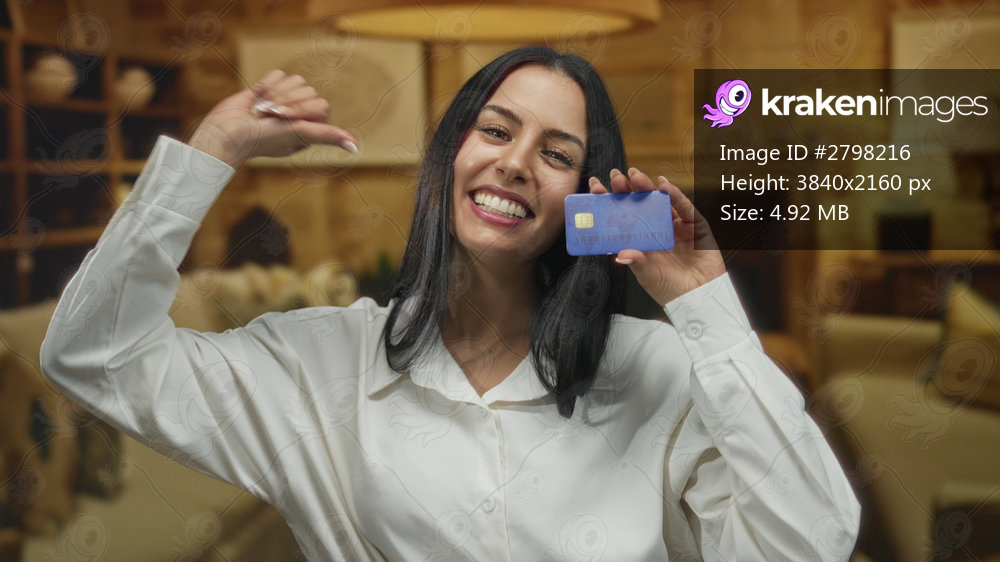 Hispanic woman indoors smiling and pointing at herself in a cozy hotel setting while proudly displaying a credit card, emphasizing leisure and travel.