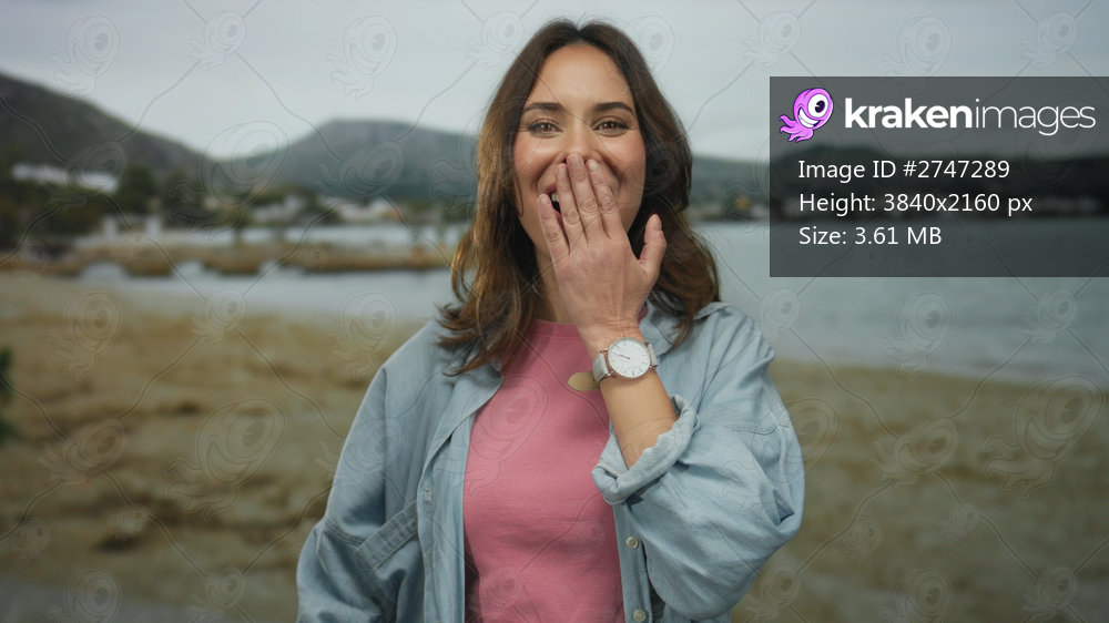 Hispanic woman joyfully expressing emotions at a beach with sea and mountains in the background, capturing a perfect blend of nature and human excitement. - Kraken Images