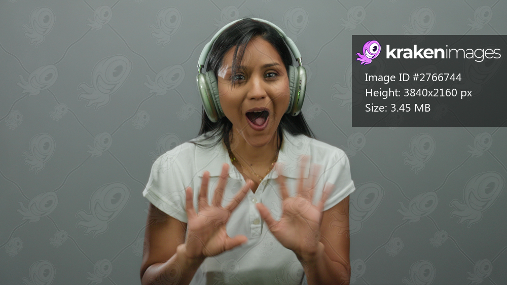 Hispanic woman listening to music with headphones, smiling energetically against a grey background in an isolated studio setting.