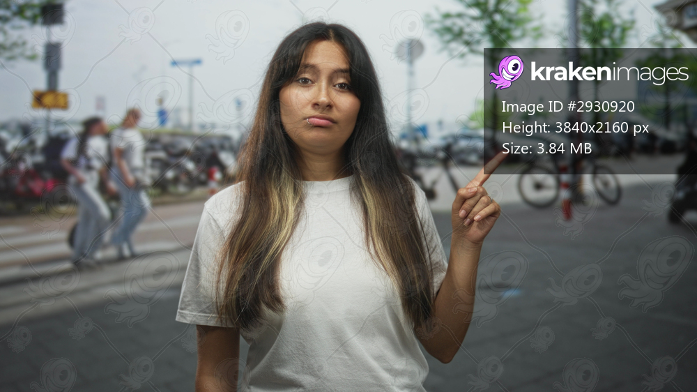 Hispanic woman with long brunette hair and lip piercing pointing finger on city street near parked bicycles and pedestrians; skepticism.