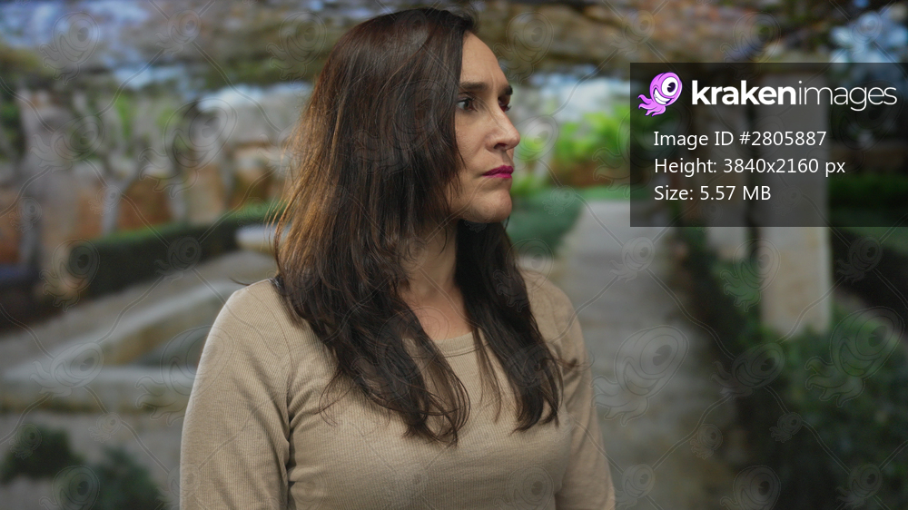 Hispanic woman with long hair standing outdoors in a serene garden setting with her eyes closed, surrounded by lush greenery and ancient stone architecture. - Kraken Images