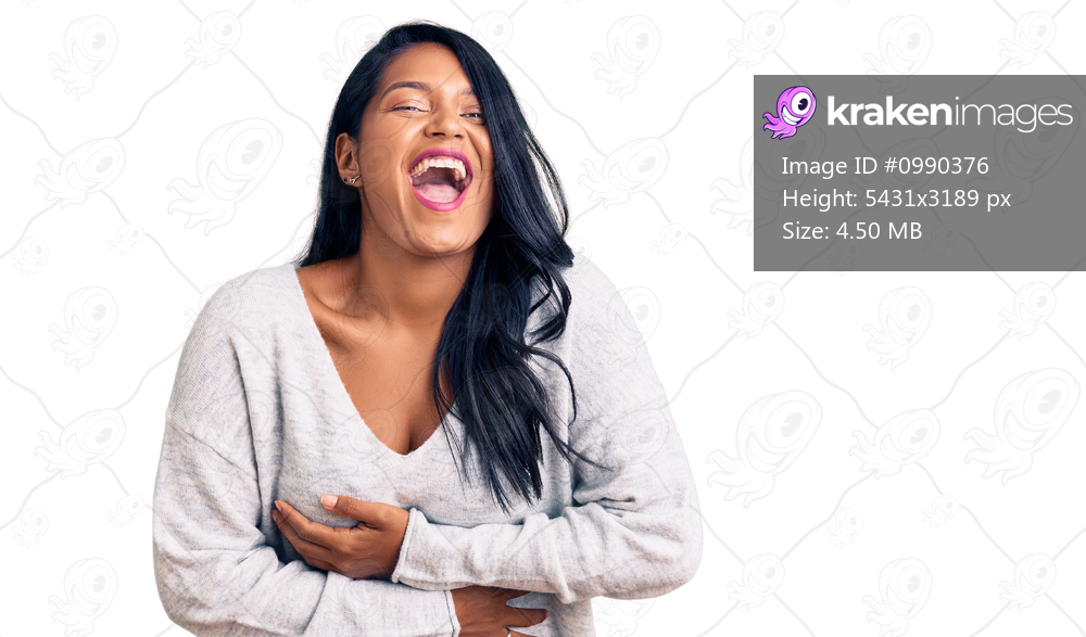 Hispanic woman with long hair wearing casual clothes smiling and laughing hard out loud because funny crazy joke with hands on body.
