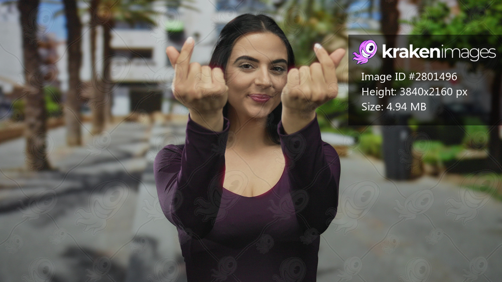 Hispanic woman makes heart gesture with fingers in sunny outdoor urban street setting, exuding happiness and confidence against a backdrop of apartment buildings and palm trees. - Kraken Images
