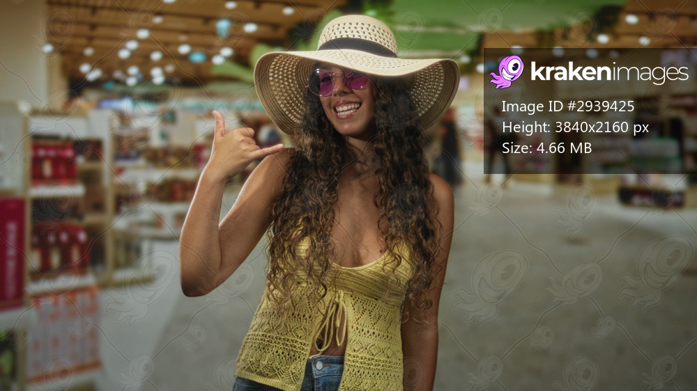 Hispanic woman makes shaka hand gesture and points finger to chest in supermarket aisle building wearing straw hat and sunglasses; summer fun relaxed.