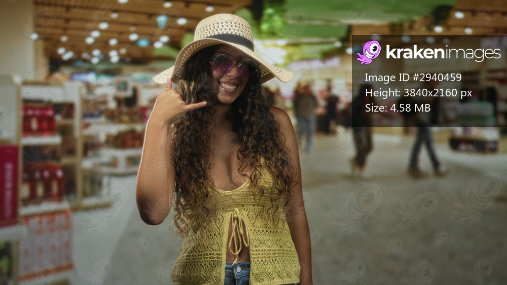 Hispanic woman makes shaka hand gesture and points finger to chest in supermarket aisle building wearing straw hat and sunglasses; summer fun relaxed.