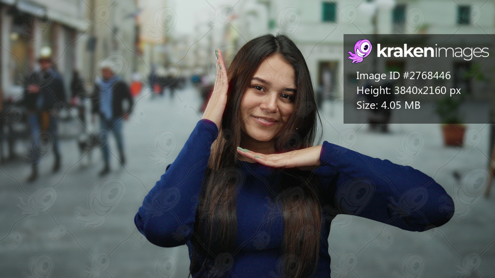 Hispanic woman making a framing gesture with her hands on a street, wearing blue, smiling amid a blurred city background with people walking.