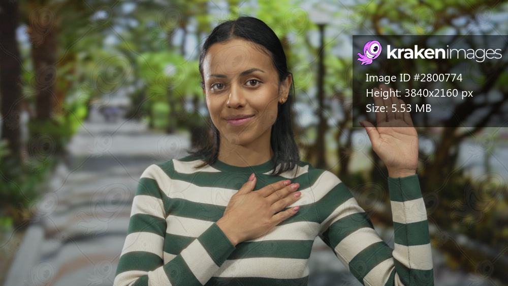 Hispanic woman making a pledge gesture in a green park with sunlight filtering through the trees, capturing a serene and committed moment outdoors.