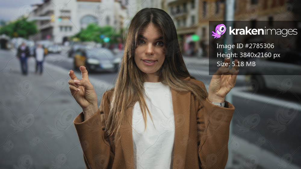 Hispanic woman making air quotes gesture on busy city street wearing casual outfit under cloudy sky.