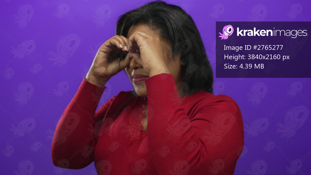 Hispanic woman mimics binoculars with hands against a vibrant purple wall, showcasing curiosity and exploration.
