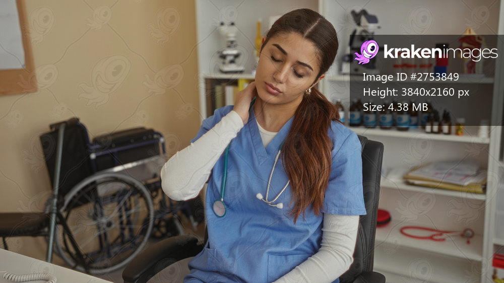 Hispanic woman nurse in blue scrubs looks tired in a hospital room with medical equipment and books on shelves beside a wheelchair, suggesting a busy workday. - Kraken Images
