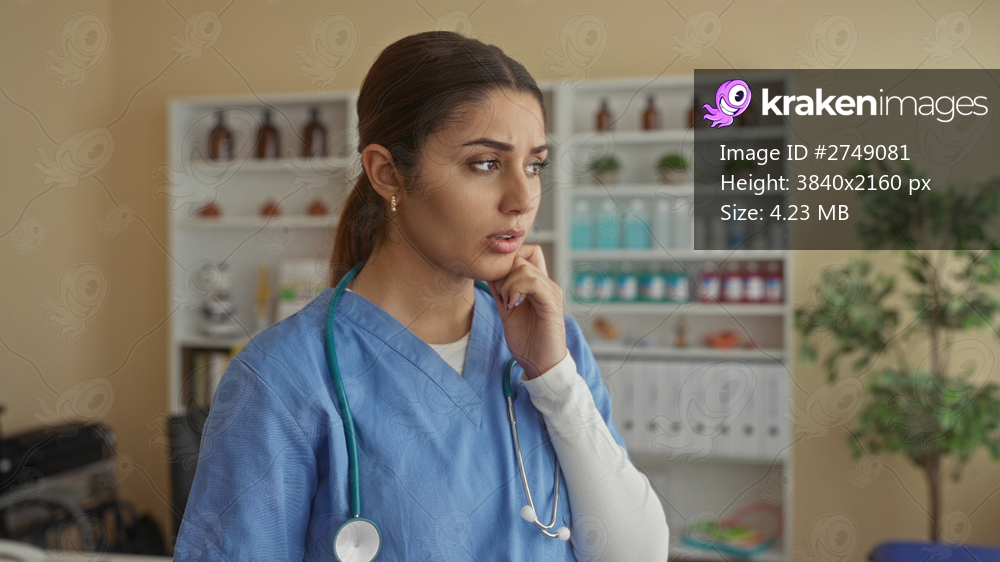 Hispanic woman nurse pondering in a hospital room wearing scrubs and a stethoscope with medical equipment in the background.