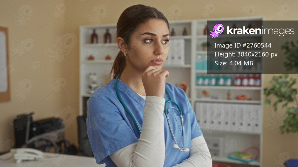 Hispanic woman nurse pondering in a hospital room wearing scrubs and a stethoscope with medical equipment in the background.