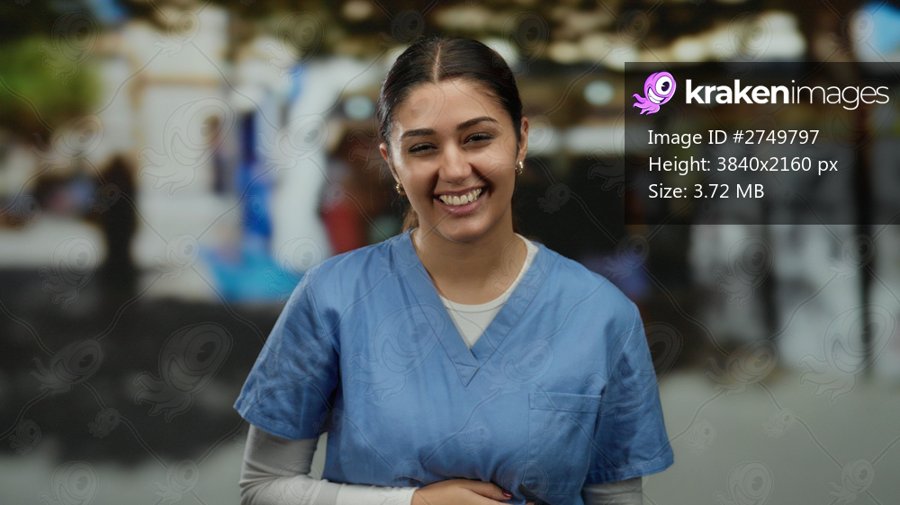 Hispanic woman nurse smiling outdoors, wearing blue scrubs, set against a blurred urban street with trees, conveying warmth and professionalism in a public space. - Kraken Images