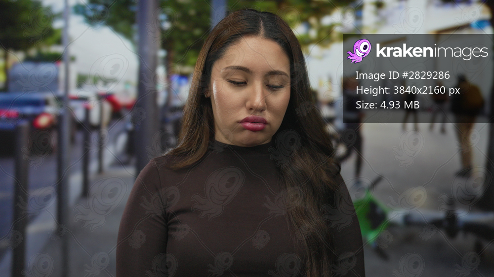 Hispanic woman offers a gentle smile on a busy urban street lined with parked scooters and blurred pedestrians; serenity.