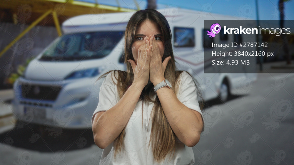 Hispanic woman on a city street in front of a white camper shows surprise while gesturing outdoors in sunlight.