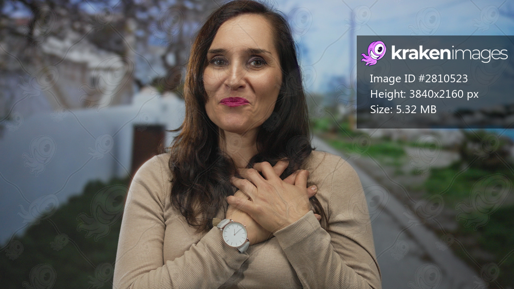 Hispanic woman outdoors with hands on chest expressing gratitude wearing casual clothes and watch on a bright sunny day with a clear blue sky and trees lining the street - Kraken Images
