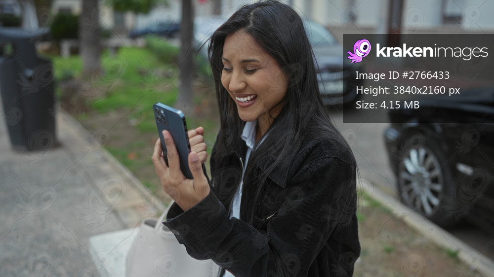 Hispanic woman outdoors in a park using smartphone while sitting on a bench, exuding happiness with her long hair and urban cars around her.