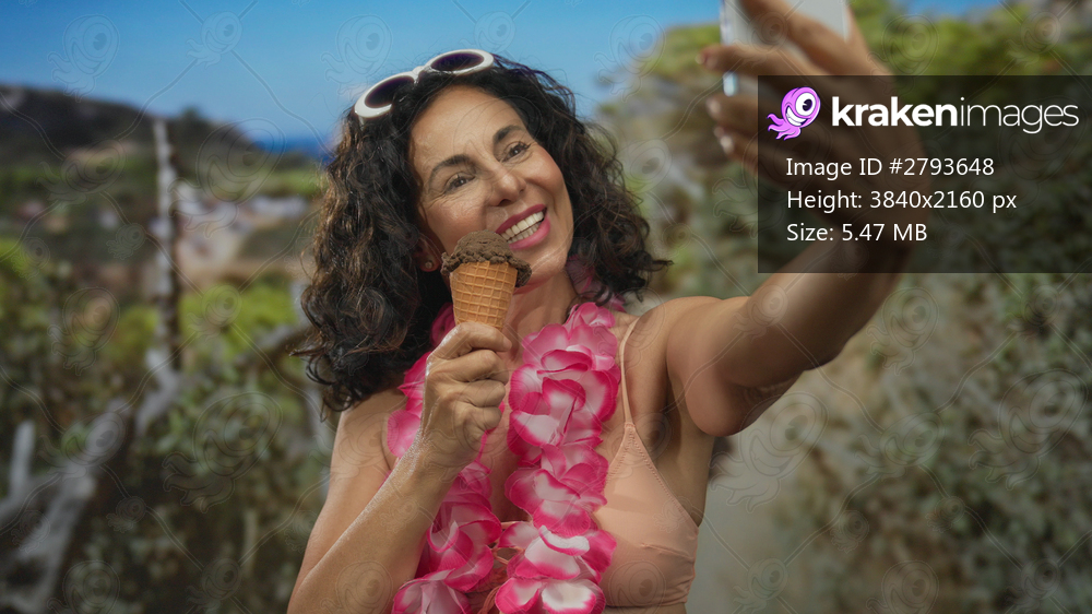 Hispanic woman outdoors in park wearing bikini and lei, enjoying ice cream while taking a selfie on a sunny day.