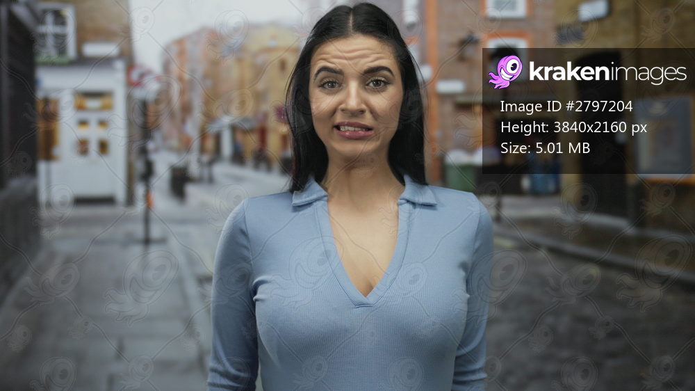 Hispanic woman outdoors on a city street making expressive gestures showcasing her emotions.