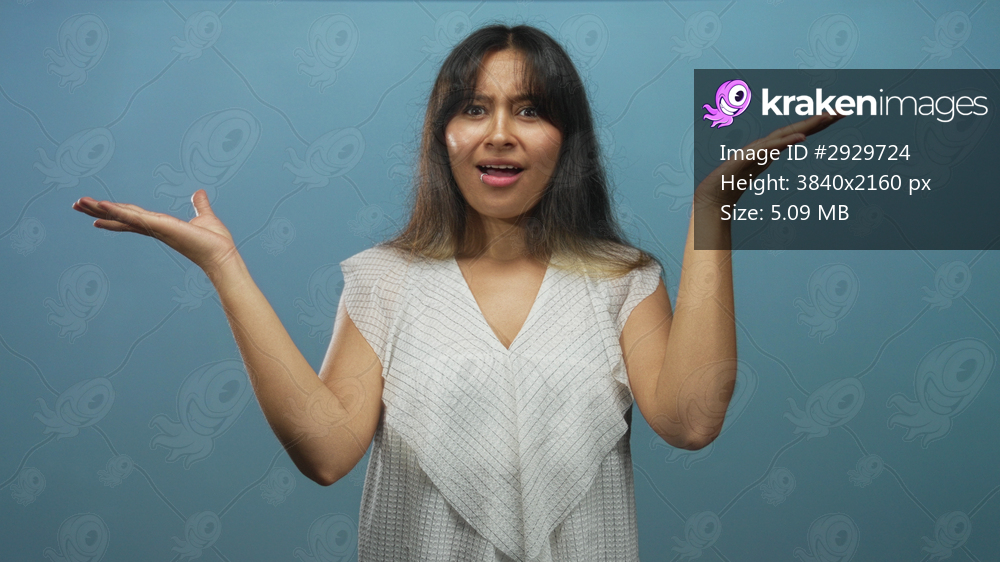 Hispanic woman with palms up gesture and open mouth expression in studio against blue wall; surprise question.