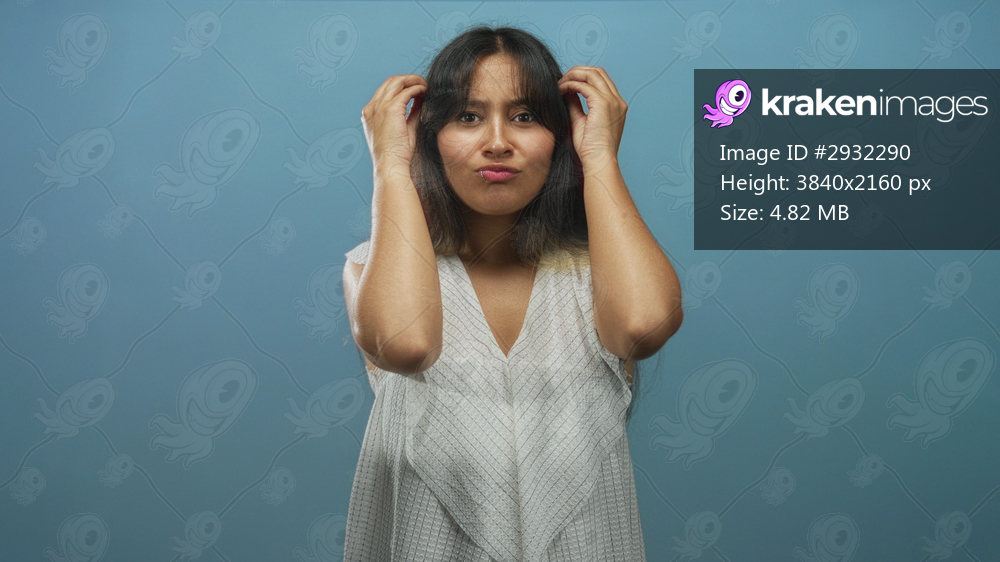 Hispanic woman with palms up gesture and open mouth expression in studio against blue wall; surprise question.