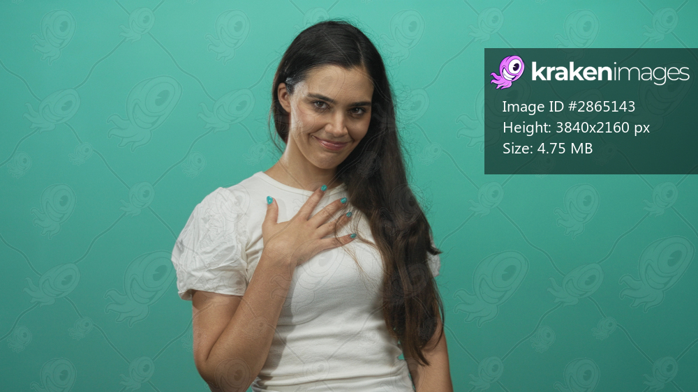 Hispanic woman placing her hand on her chest in a teal studio wearing a fitted white shirt; gratitude.