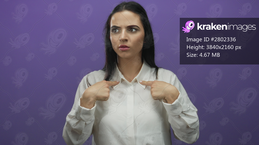 Hispanic woman pointing at herself with a questioning expression against a purple wall background, wearing a white shirt, illustrating confusion and self-reflection. - Kraken Images
