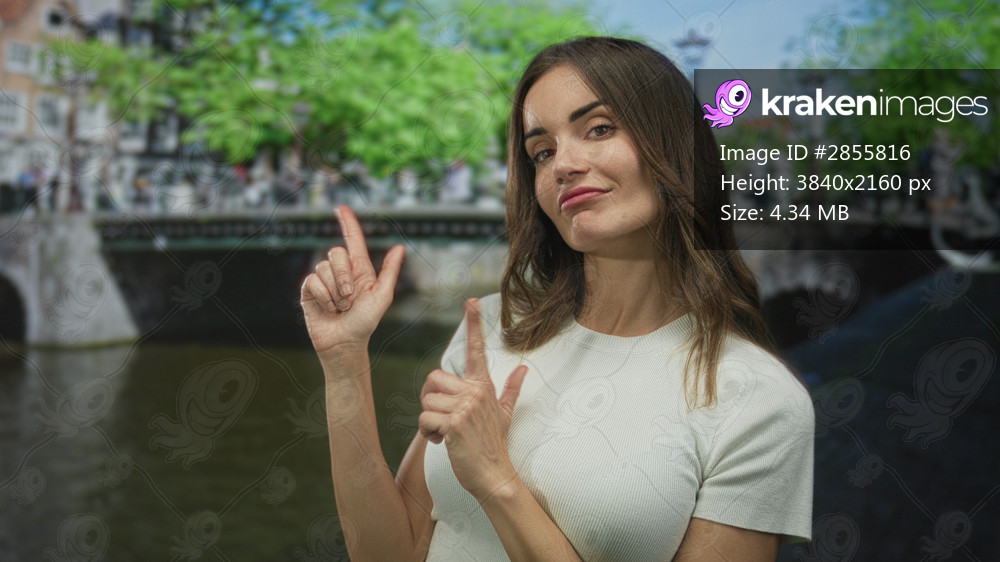 Hispanic woman pointing finger at building along an amsterdam canal framed by water and green trees; wonder.