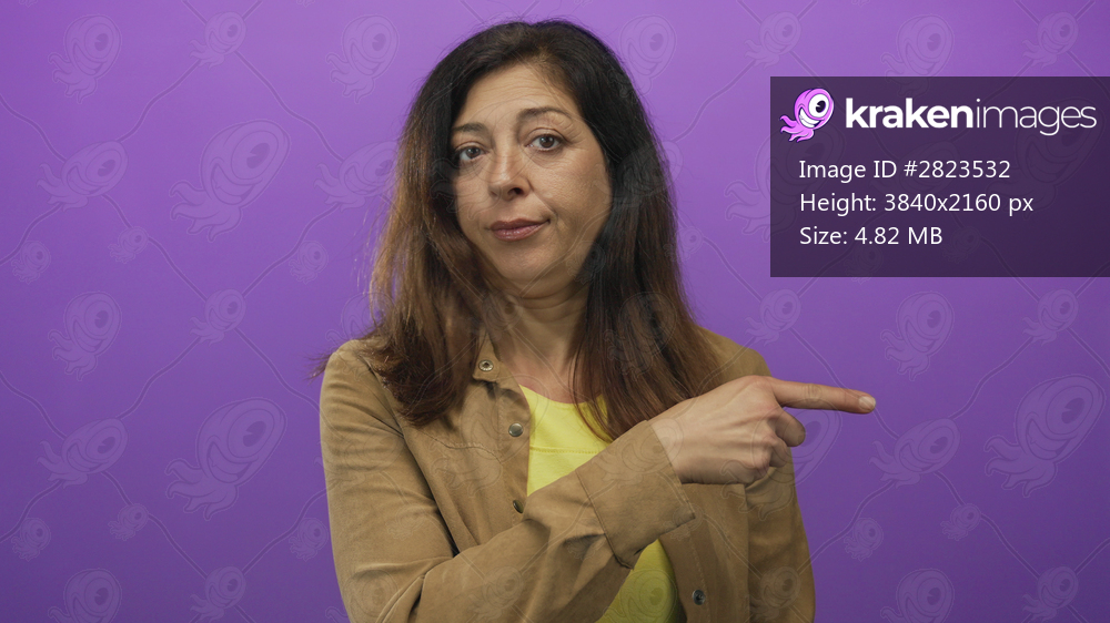 Hispanic woman pointing finger at side with head turned sideways against purple studio wall with neutral expression; skepticism.