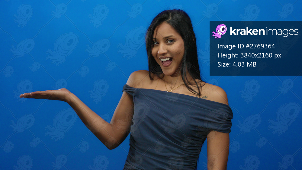 Hispanic woman pointing and gesturing thumbs up against an isolated blue background, showcasing enthusiasm and positivity in a modern setting.