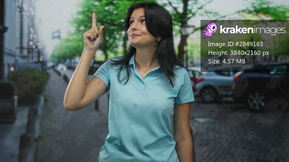 Hispanic woman pointing index finger to the sky on a tree lined street with parked cars; curiosity.