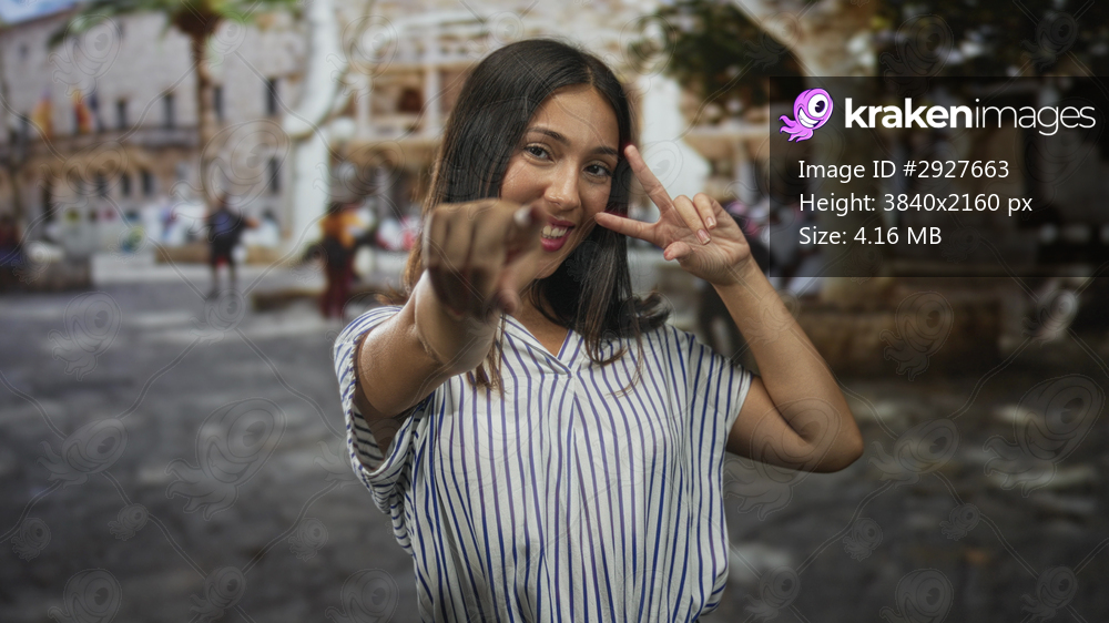 Hispanic woman points finger at camera and shows peace sign on street near building; joy travel smile.